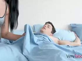 Mom and boys Stubby stepmom riding a white stick in the bedroom with a brush