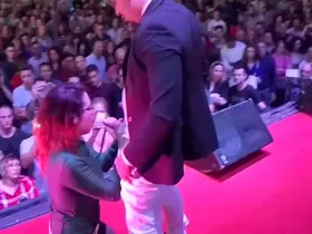 Men having anal sex in front of a popular AV actress in a neon jacket