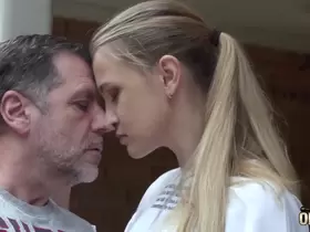 Gradpa fucks tight and wet young girl who plays with her pussy and cum in her mouth